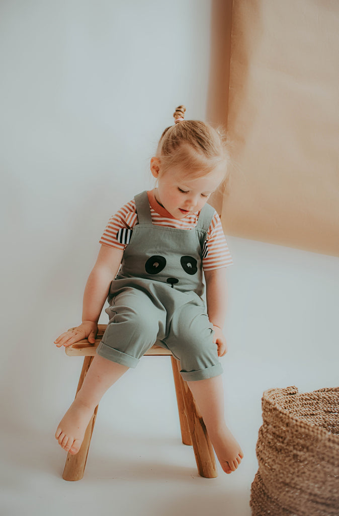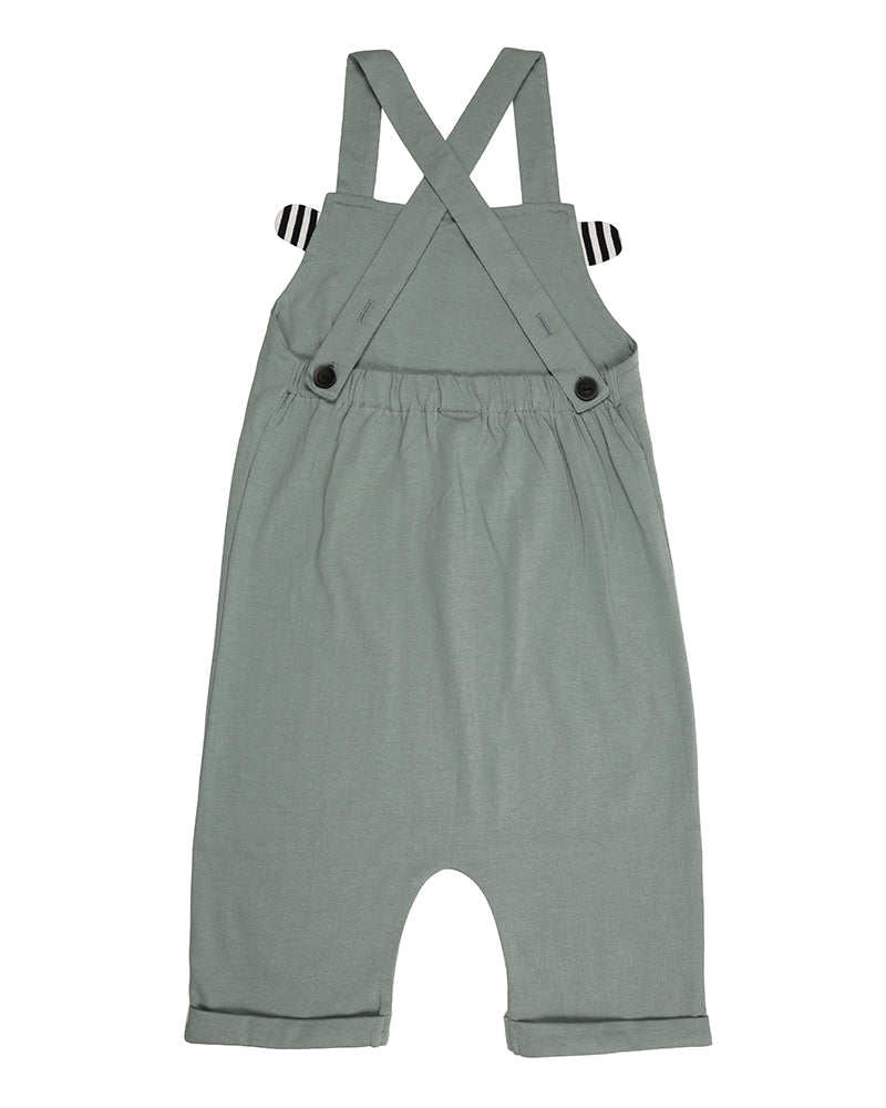 TDs best selling dungarees but with a short leg version for summer dressing! The relaxed fit shape has a dropped crotch and wider seat for a comfort fit. The straps fasten to a lower cut back and can be adjusted to two button positions for extra growing room. These kelp coloured dungarees look great worn back with one of our tops for cooler days too. Little ones will love the 3-D animal ears too!