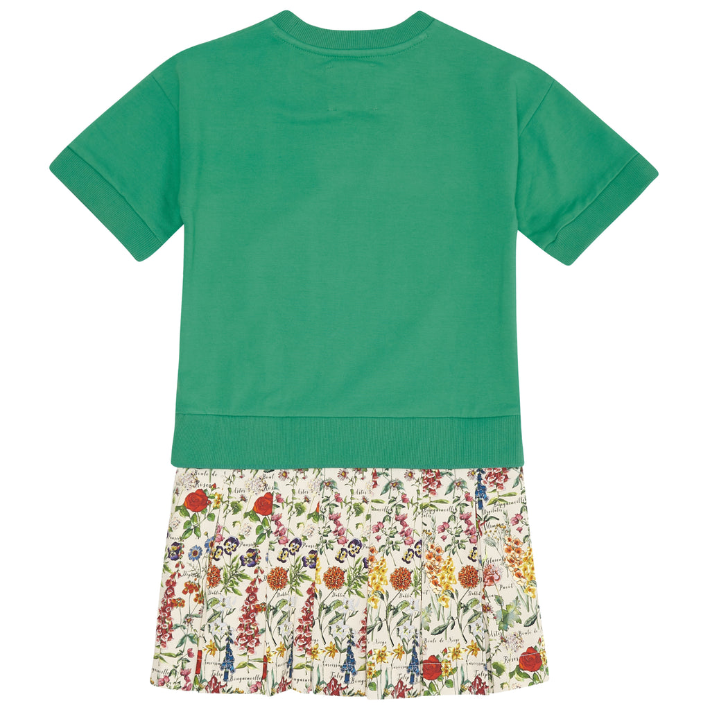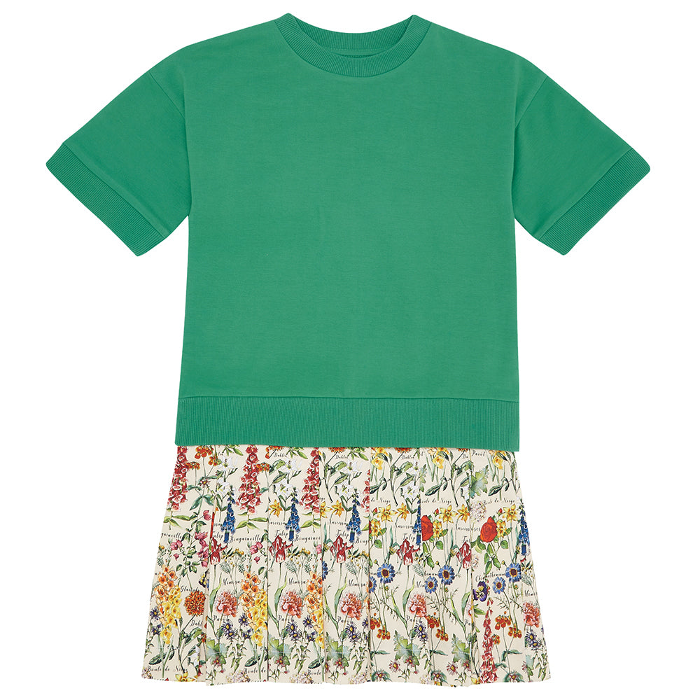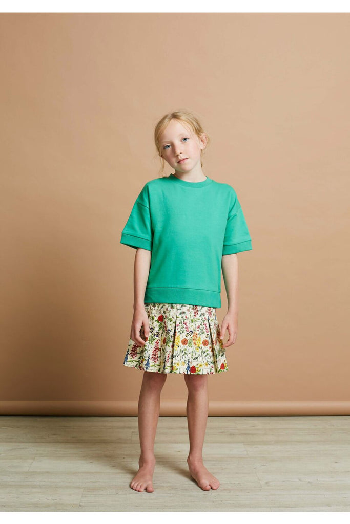 Made from a soft loop-back sweat with rib detail, a dropped shoulder and long’ish short sleeves. Sweat finishes at a dropped waist length. Pleated skirt in Botanical print. Skirt is made from polyester so pleats remain forever chic when washed!