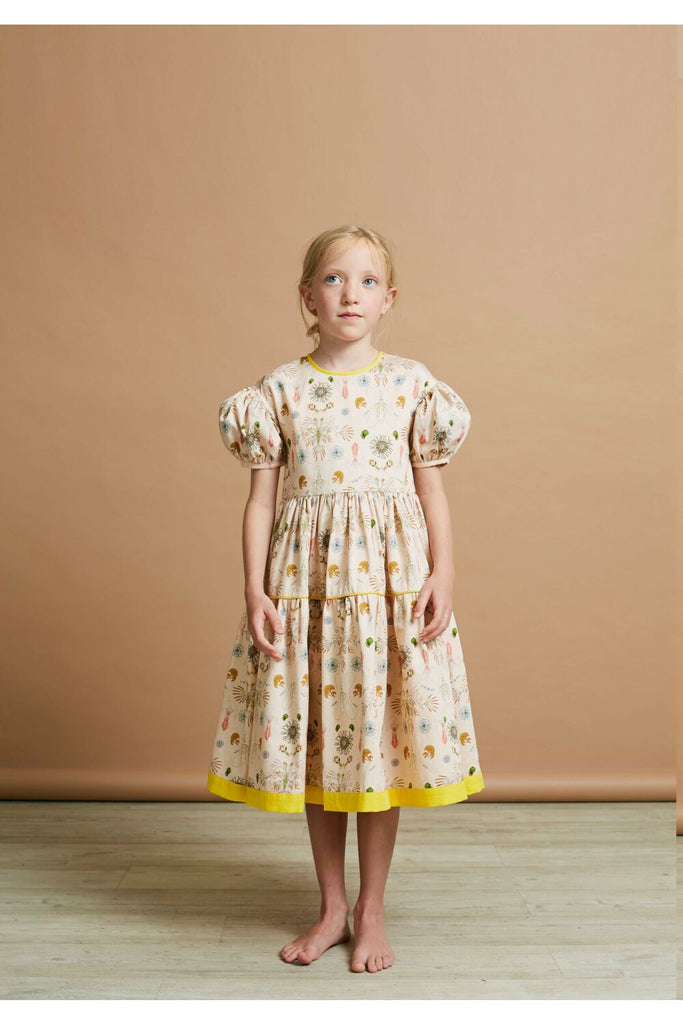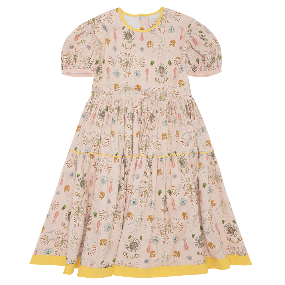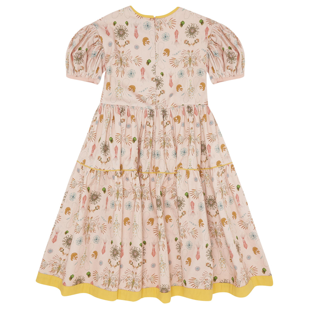 This elegant shape dress with fitted bodice and gathered skirt from 'The Middle Daughter', award winning girls fashion brand. Made in a soft cotton poplin in our own developed print. Featuring a dropped shoulder puff sleeve, part elastic to cuff and deep contrast hem. Concealed zip to centre back with grosgrain zip guard and fully lined.